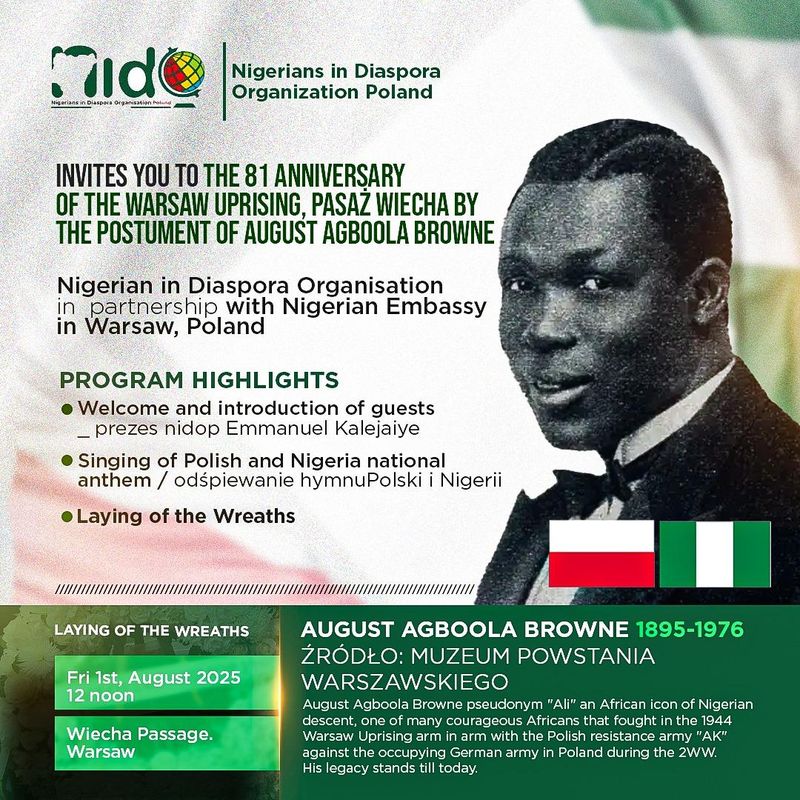 1 sierpnia, o godz.12, w Warszawie rozpoczęły się uroczystości poświęcone Augustowi Agboola Browne’owi, polskiemu muzykowi pochodzenia nigeryjskiego.