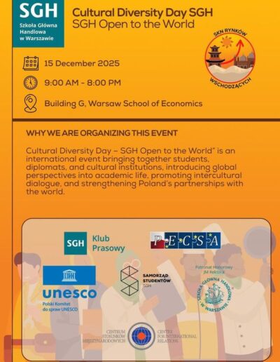 Dzień Różnorodności Kulturowej – „SGH Open to the World” stanowi jedną z pierwszych inicjatyw rozwijanej w SGH Katedry UNESCO ds. Przemysłów Kreatywnych i Różnorodności Kulturowej dla Zrównoważonego Rozwoju.